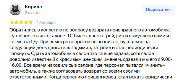 грамотную помощь, т.к. в подобную ситуацию попал впервые. Сотрудники коллеги оперативно выслушали проблему и дали необходимые рекомендации, следуя которым я сдал ТС и поехал на встречу к юристам. При встрече, подключился к нашей проблеме наверное весь коллектив! Коллегиально выстроены шаги и действия, как с нашей стороны, так и со стороны коллегии, заключен договор. На утро следующего дня был готов необходимый пакет документов, который мы совместно с юристом отвезли в автосалон. По результатам совместных действий автосалон вернул денежные средства. Да, забыл совсем, мы приехали за этой машиной из другого города, поэтому оперативность действий была для нас важна. Привет вам, добрые люди Юниона из новогодней столицы Сибири! Юрий Андреевич, Дмитрий, Вячеслав- сердечно жму руки и желаю успехов в вашем деле! Вы лучшие! P.S. Прикрепляю фото нашего места временного жительства, где мы ждали решения от салона 7 часов! Если вы видите данную обстановку перед собой, лучше покиньте, сохраните нервы, время и деньги.